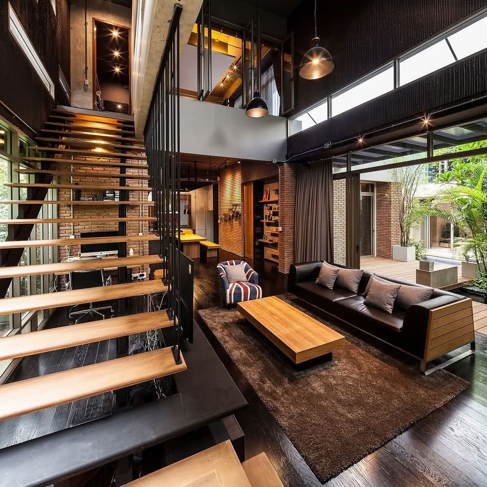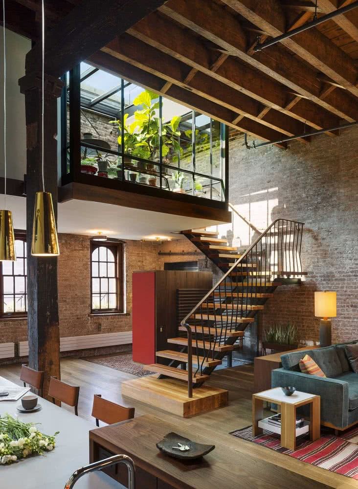 Unele dintre semnele distinctive ale designului casei industriale includ pereti expusi din caramida, rafturi metalice, lemn si materiale industriale, cum ar fi tevile sanitare.
